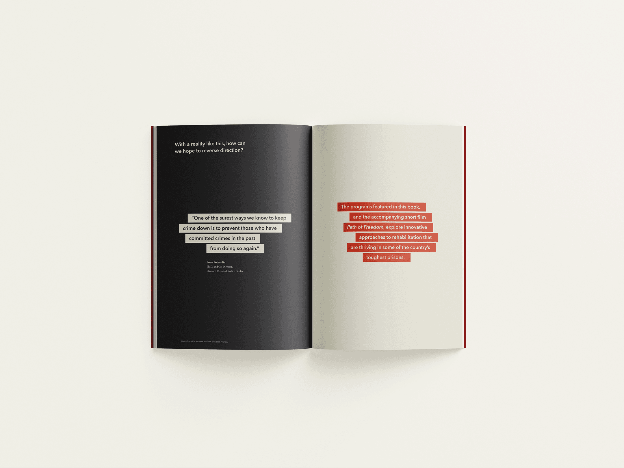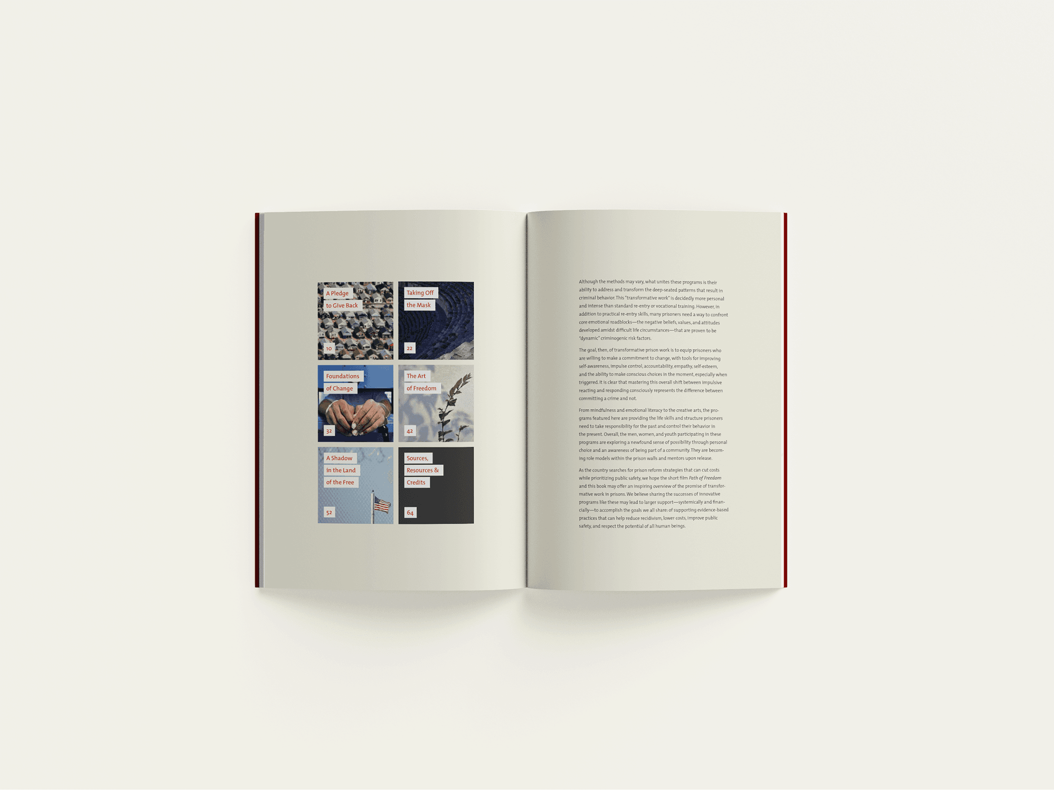 Book design for GO Project’s ‘Path of Freedom’. Featuring six long form stories that explore innovative and successful approaches to inmate rehabilitation, which are thriving in some of the toughest prisons in the United States.